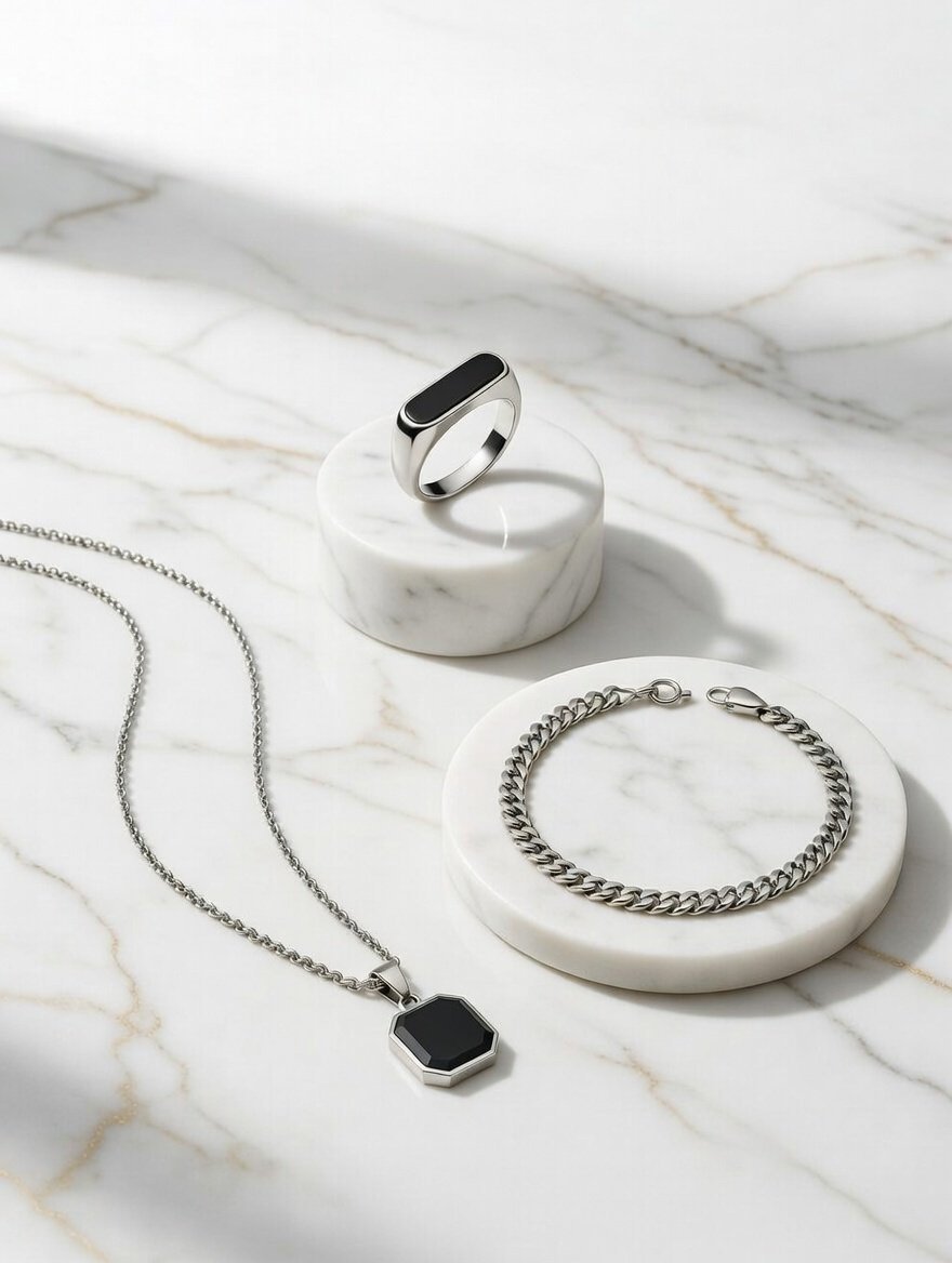 BLACK SILVER RING, MENS LOCKET AND SILVER SNACK CHAIN BRACELET