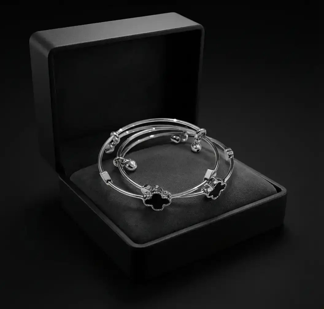 “Elevate your style with our luxurious silver-toned bangle featuring elegant black quatrefoil accents! ✨ Perfect for adding a touch of sophistication to any outfit. Shop now at WANTED BY SK for exclusive jewelry collections! 💼👌 #LuxuryJewels #BangleBling #YourStoreName”