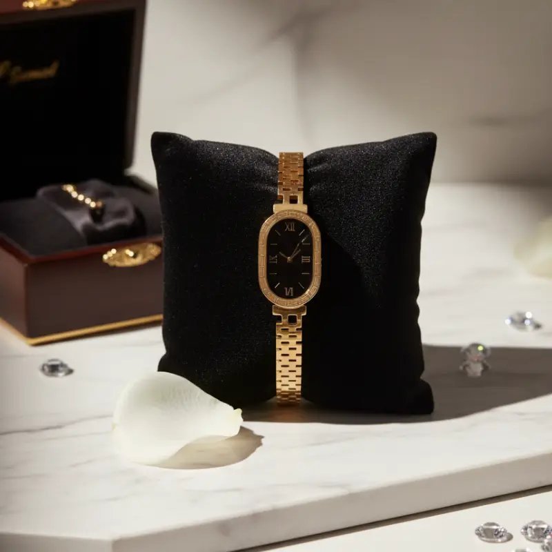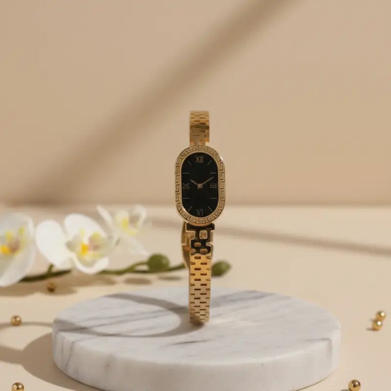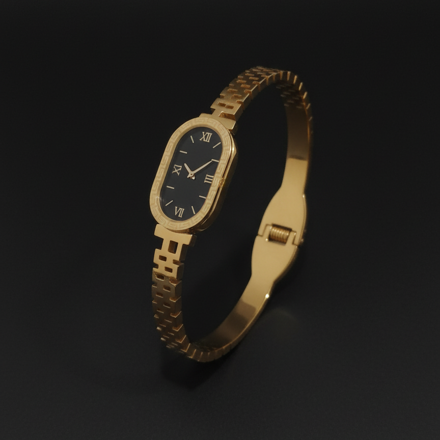 This elegant gold-toned watch features an oval black dial with gold Roman numerals and slender gold hands, set in a sleek gold case and bracelet with a refined geometric link design. Perfect for adding a touch of sophisticated style to any outfit, it makes a timeless accessory for fashion‑forward customers.